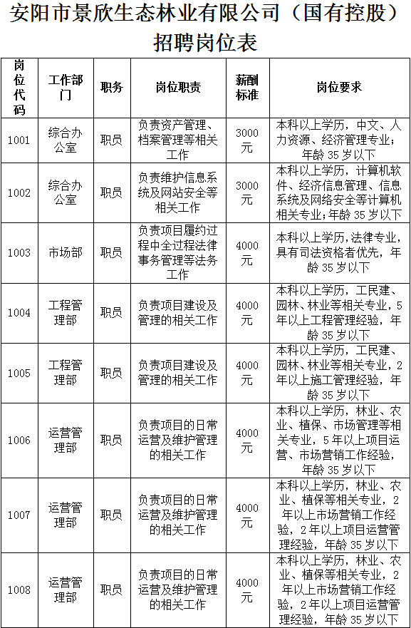 根據(jù)工作發(fā)展需要,現(xiàn)委托安陽鼎泰勞務(wù)派遣有限責(zé)任公司面向社會(huì)公開招聘8名員工,派遣至安陽市景欣生態(tài)林業(yè)有限公司工作?,F(xiàn)將有關(guān)事項(xiàng)公告如下: